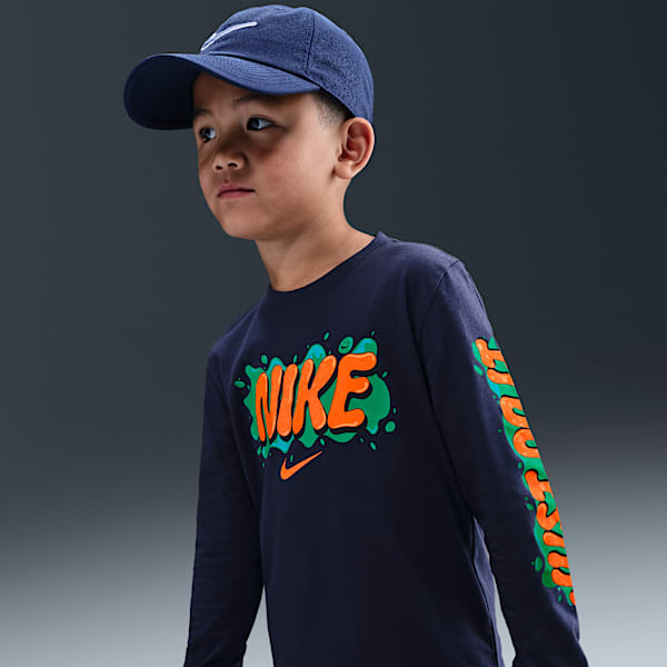 Nike’s signature logo is classic. If you’re shopping for a boys’ graphic tee that will be universally beloved, look no further than a classic Nike shirt emblazoned with a printed or embroidered logo. It's something he might wear for years to come. Nike’s logo tees come in both short-sleeved and long-sleeved silhouettes — so you’ll be able to find something that fits his look.