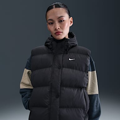A form-fitting Nike Therma-FIT vest fits well under a ski coat and regulates body temperature to keep warm without overheating. Synthetic and down fill keeps these vests lean and lightweight, while a fleece collar adds protection from cold air.