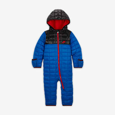 Nike bietet eine Auswahl an Jumpsuits und Schneeanzügen für Babys mit unterschiedlich ausgeprägter Bedeckung. Einige dieser Modelle sind Stepp-Schneeanzüge mit synthetischer Isolierung, andere sind aus einem warmen, kuscheligen Fleece-Material gewebt, das die Kleinen bei niedrigen Temperaturen angenehm warm hält.