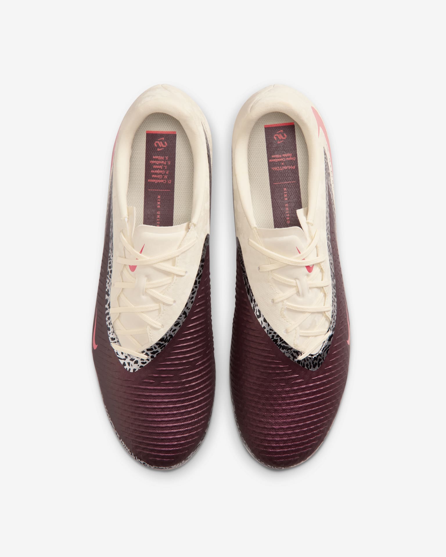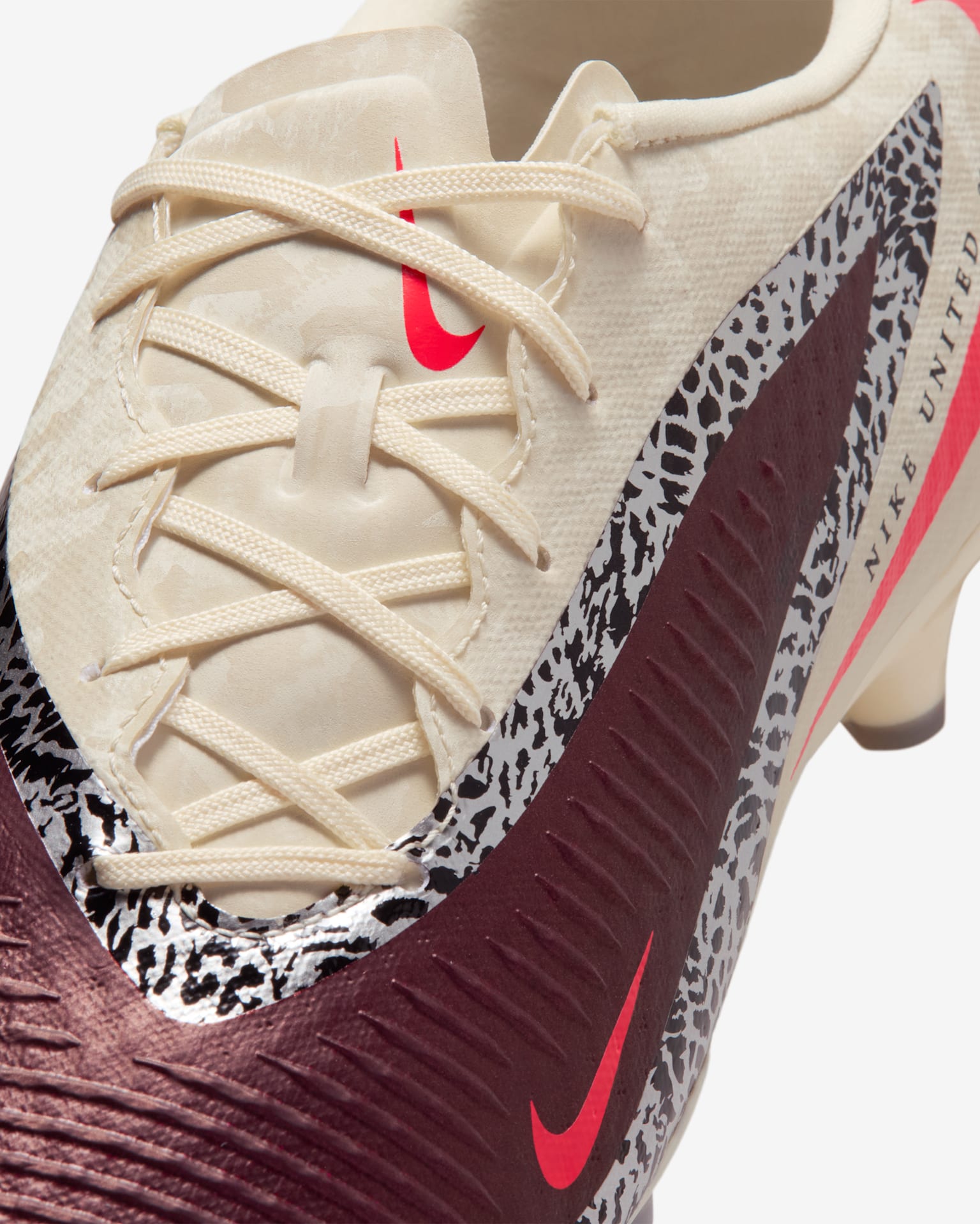 The Nike United collection celebrates wildly accurate athletes like Sophia Wilson and Deyna Castellanos. We paired rich Burgundy tones with animal-print-inspired graphics to represent how they attack on the field and go beyond what's possible.