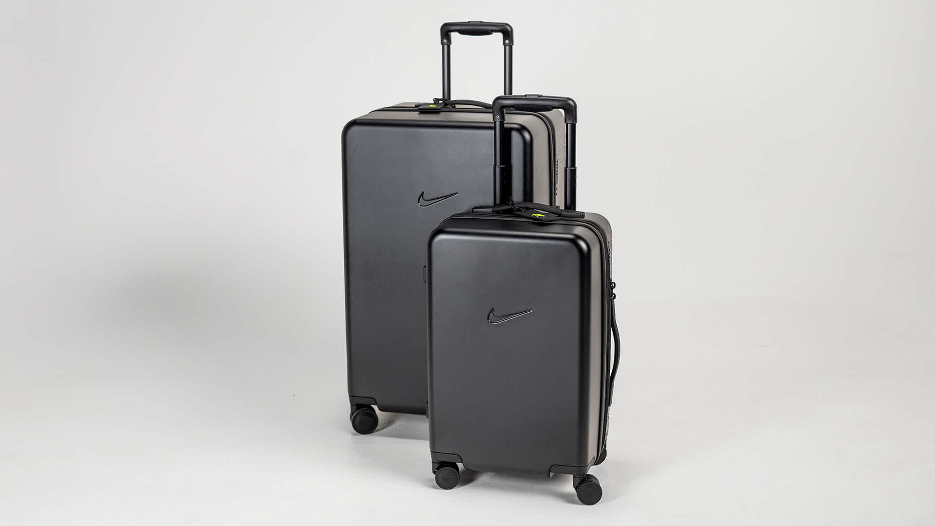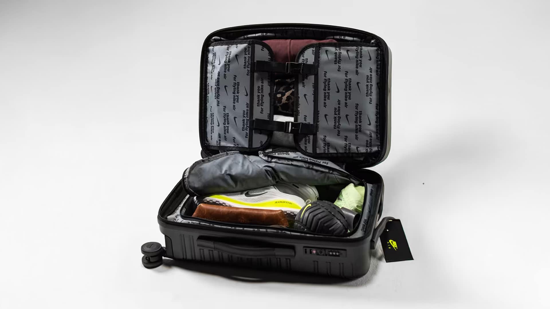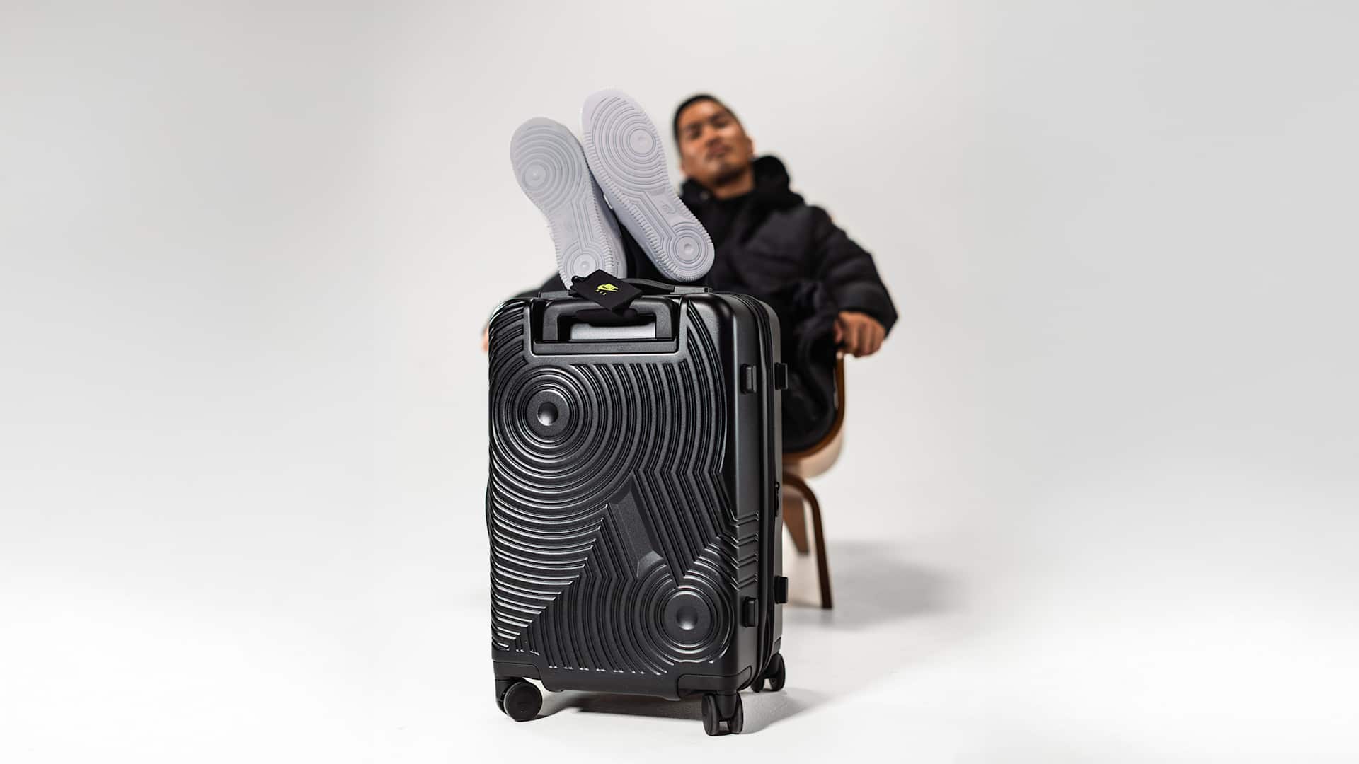 スーツケースの前面にはシンプルなNike Swooshロゴ、背面にはアイコニックなナイキ エア フォース 1のソールデザインを刻印。