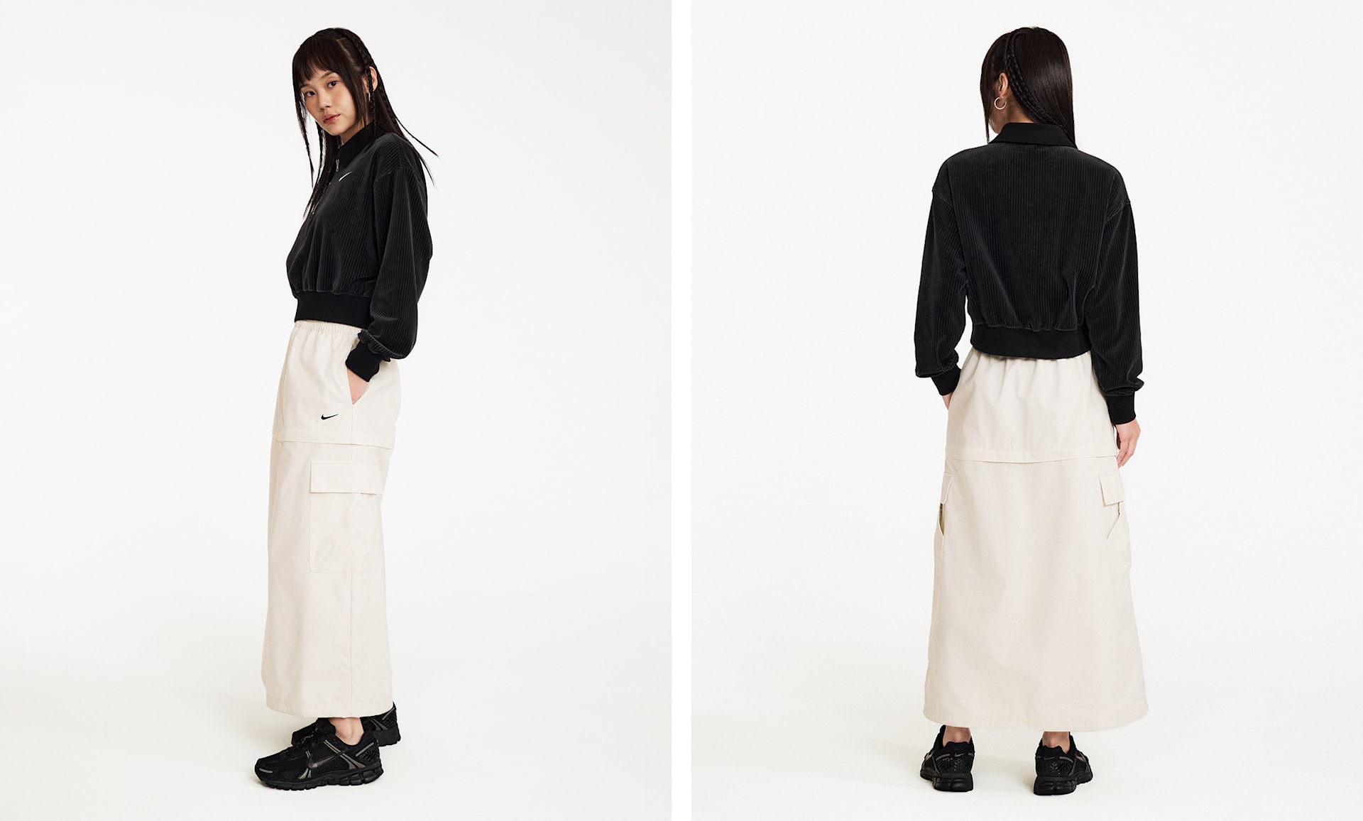 미디나 미니 중에서 무엇을 선택할지 고민이신가요? 포켓 위에 지퍼가 있는 이 루즈 핏 립스탑 스커트를 이용하면 쉽게 선택을 내릴 수 있습니다. 밑단의 번지 코드로 다양한 스타일을 연출해 보세요.