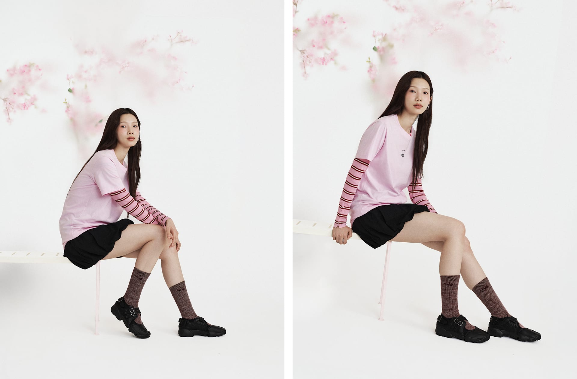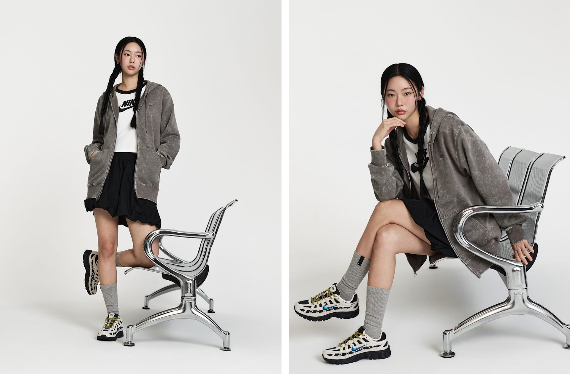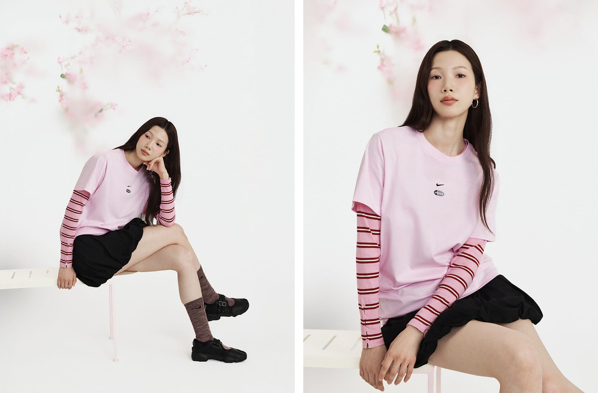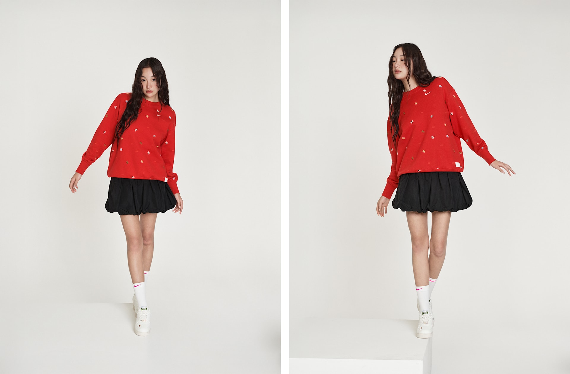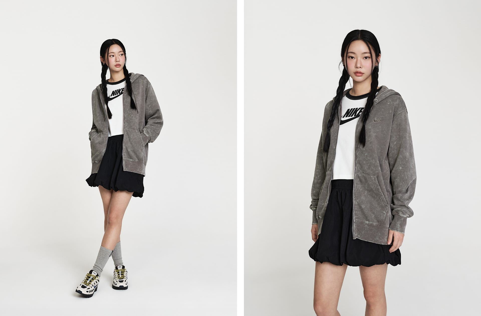 스포츠에서 영감을 얻은 스타일이 재탄생했습니다. 버블 밑단의 풍성한 룩이 넉넉한 태피터 스커트를 모던한 스트리트 스타일로 연출해 줍니다.