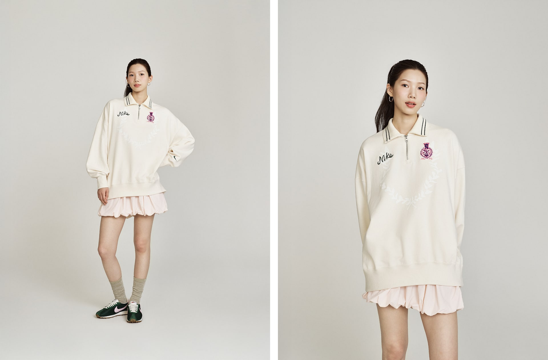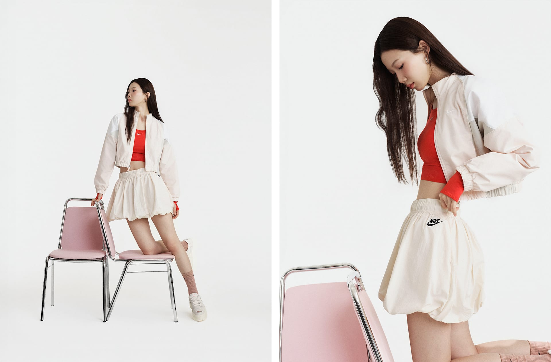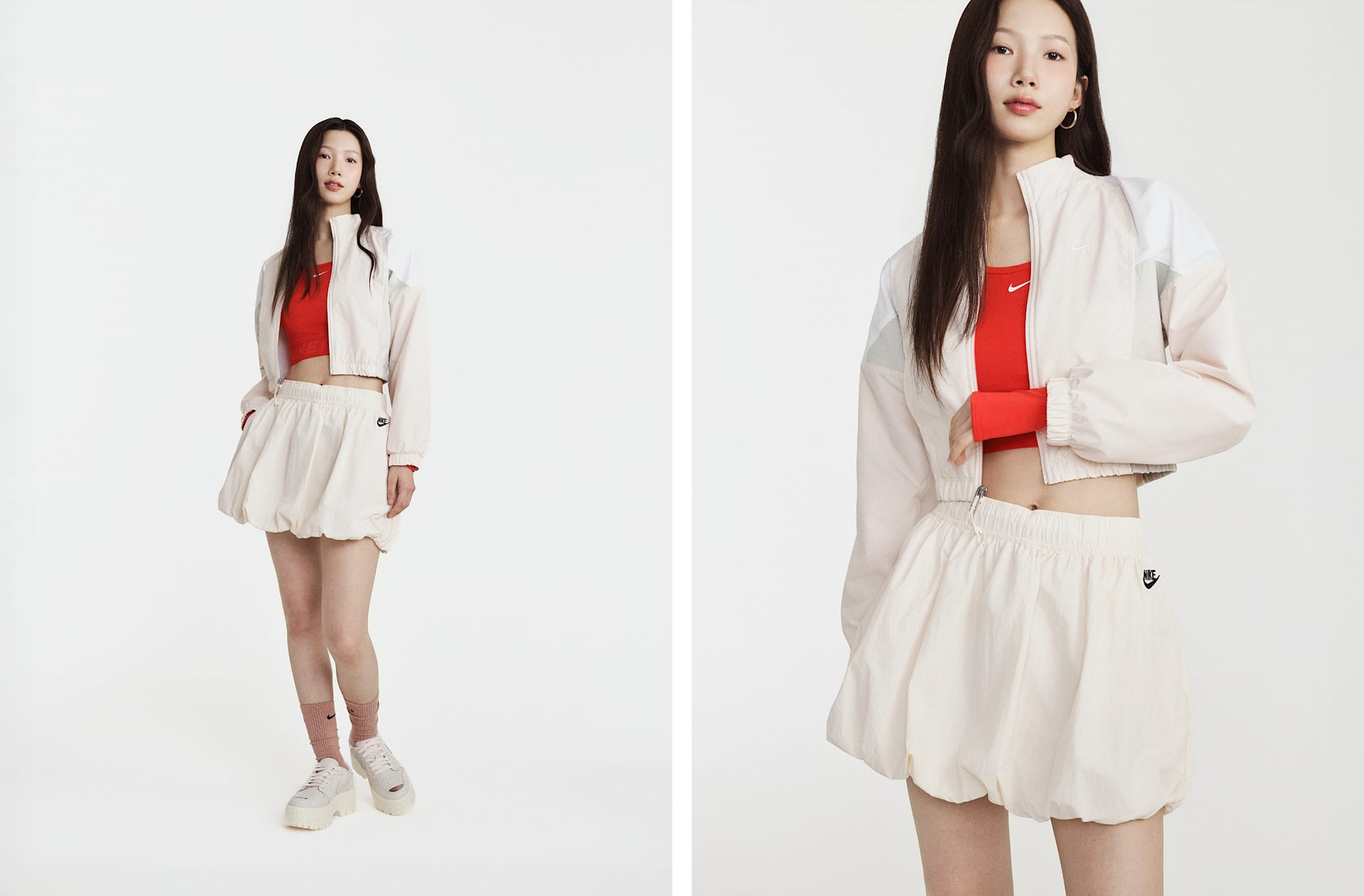 스포츠에서 영감을 얻은 스타일이 재탄생했습니다. 버블 밑단의 풍성한 룩이 넉넉한 태피터 스커트를 모던한 스트리트 스타일로 연출해 줍니다.