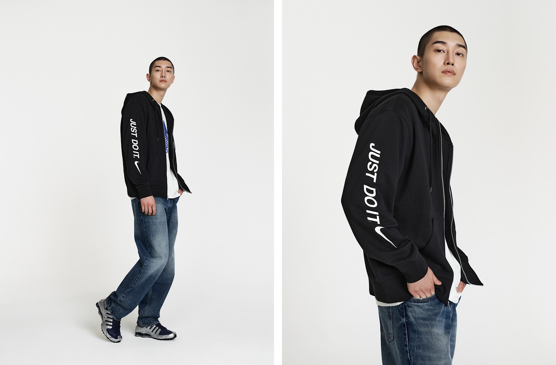 남자 모델 키 : 186cm 착용 사이즈 : XL 착용 제품 : 378341-402, IH7961-084