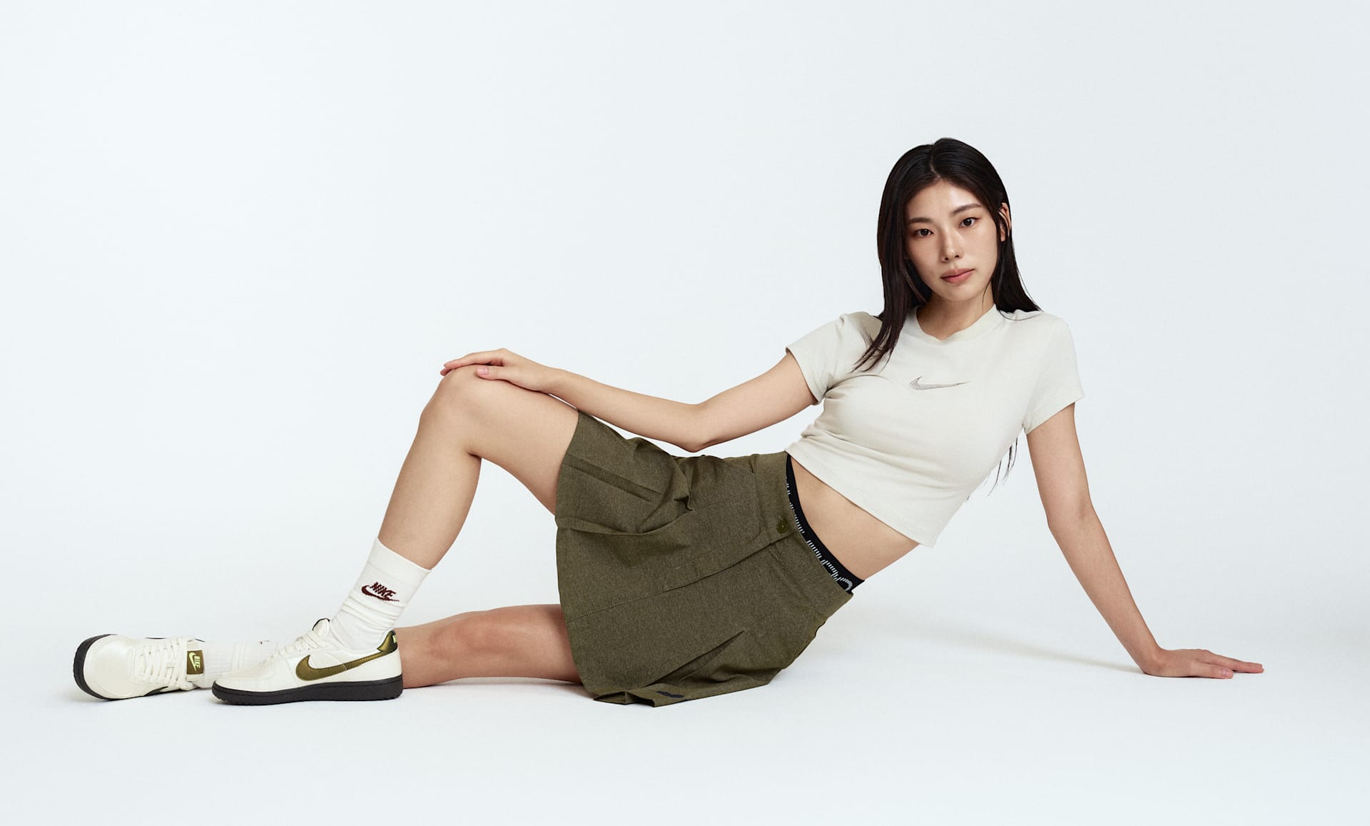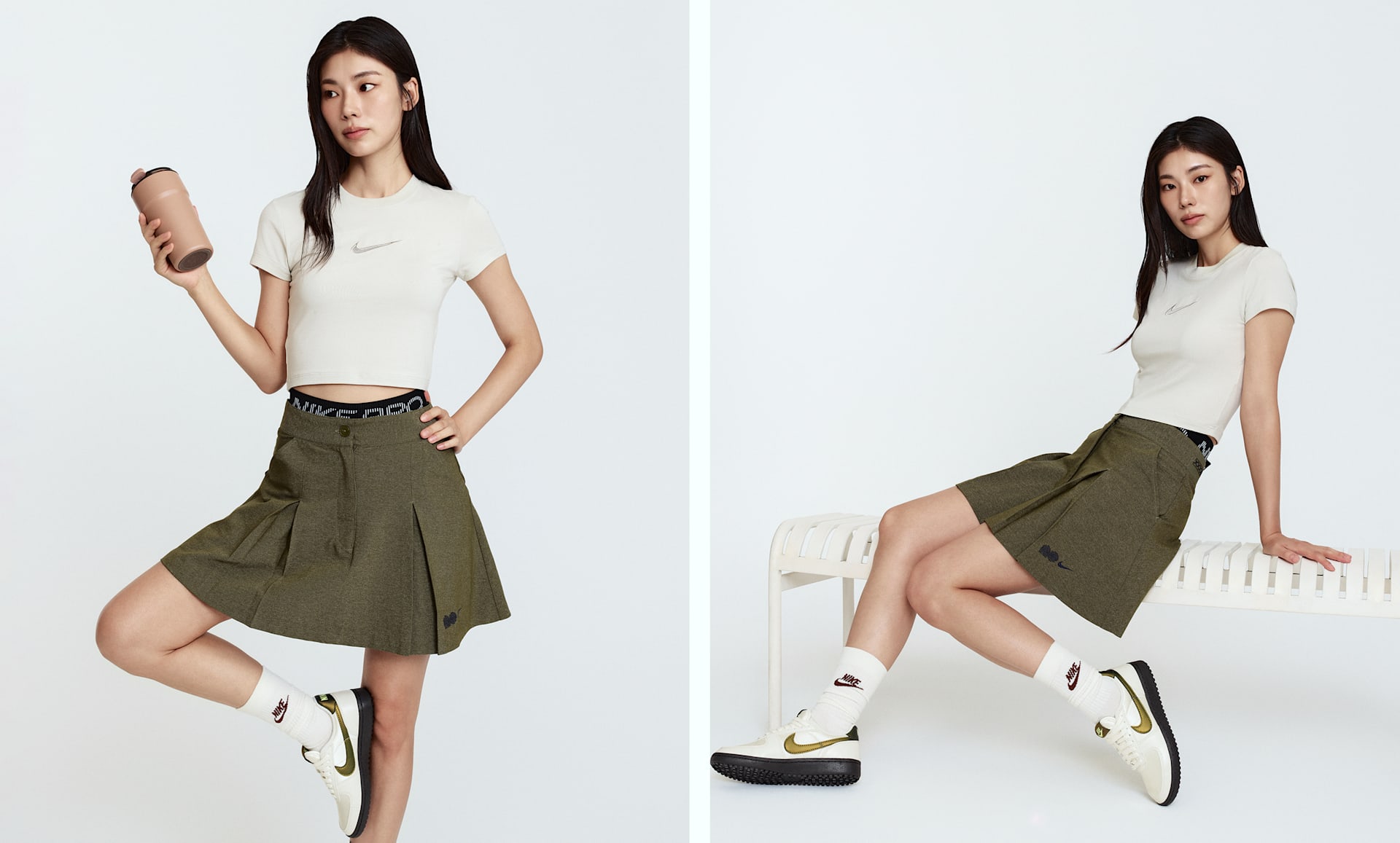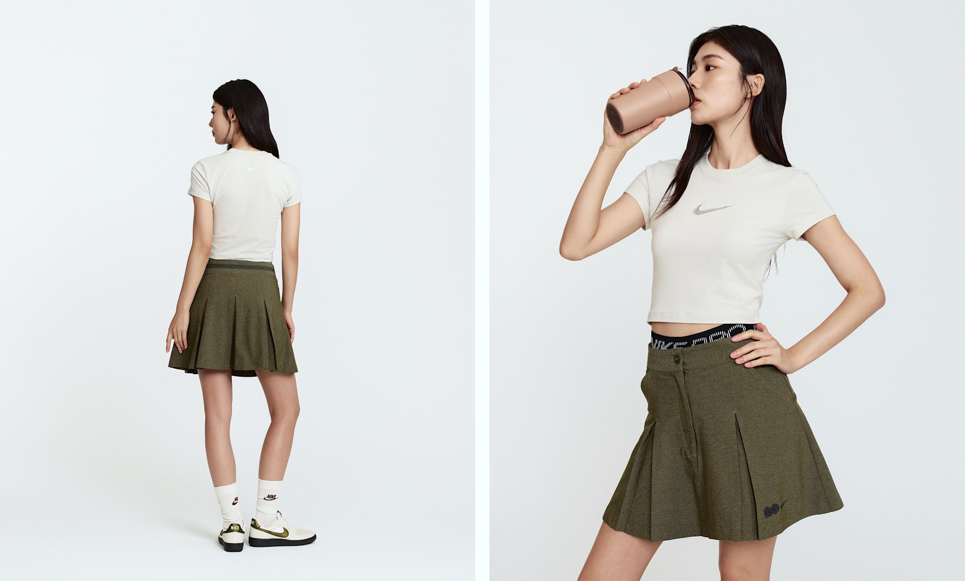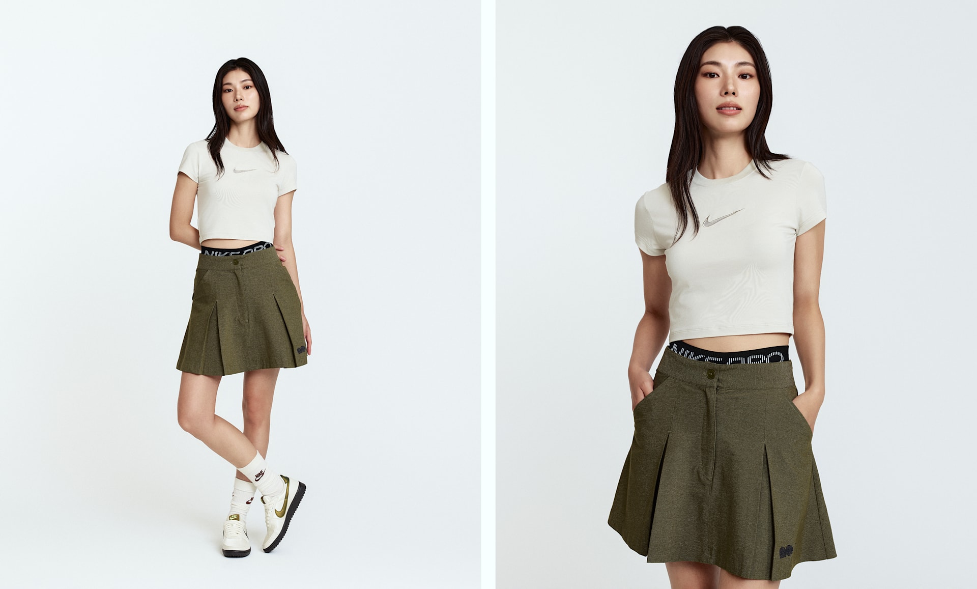 나오미 오사카의 의견을 반영해 코트 안팎에서 나오미가 보여주는 모습에서 영감을 받은 플리츠 스커트가 탄생했습니다. 허리밴드의 십자형 디테일이 테니스에 뿌리를 둔 나오미를 나타냅니다. 형태를 잘 유지하면서도 가벼운 우븐 소재로 제작되어 자연스럽게 흐르듯 움직입니다.