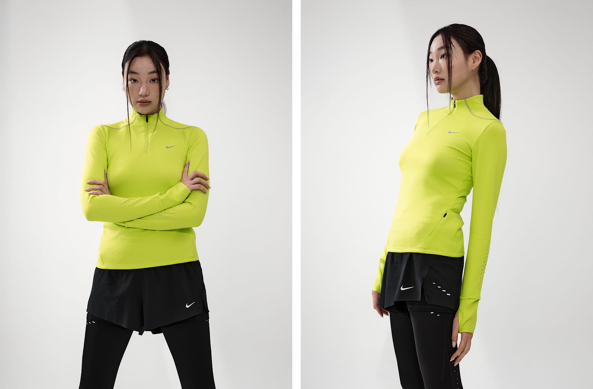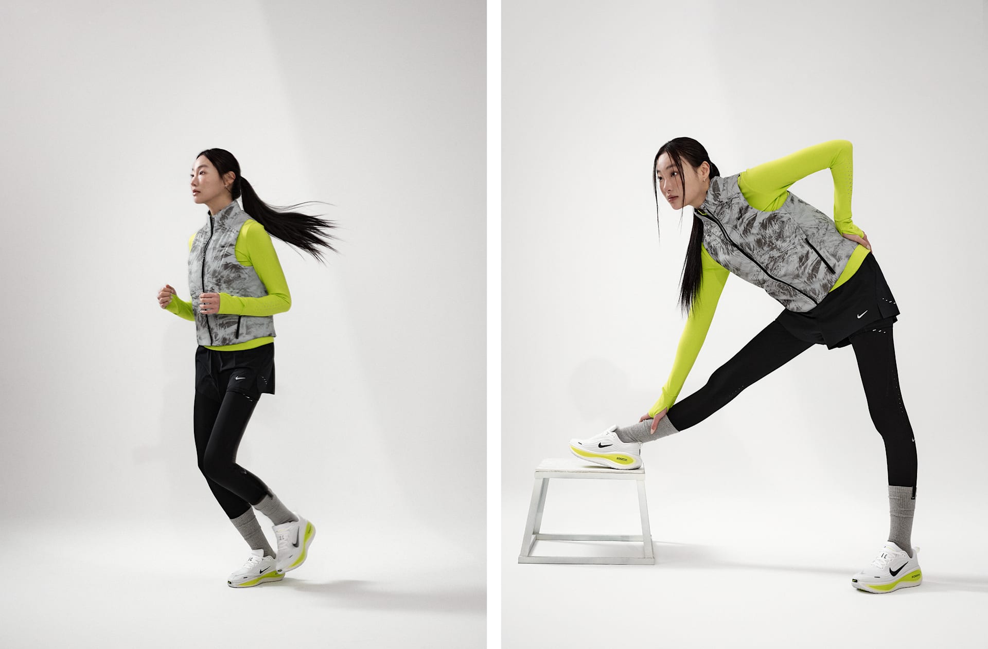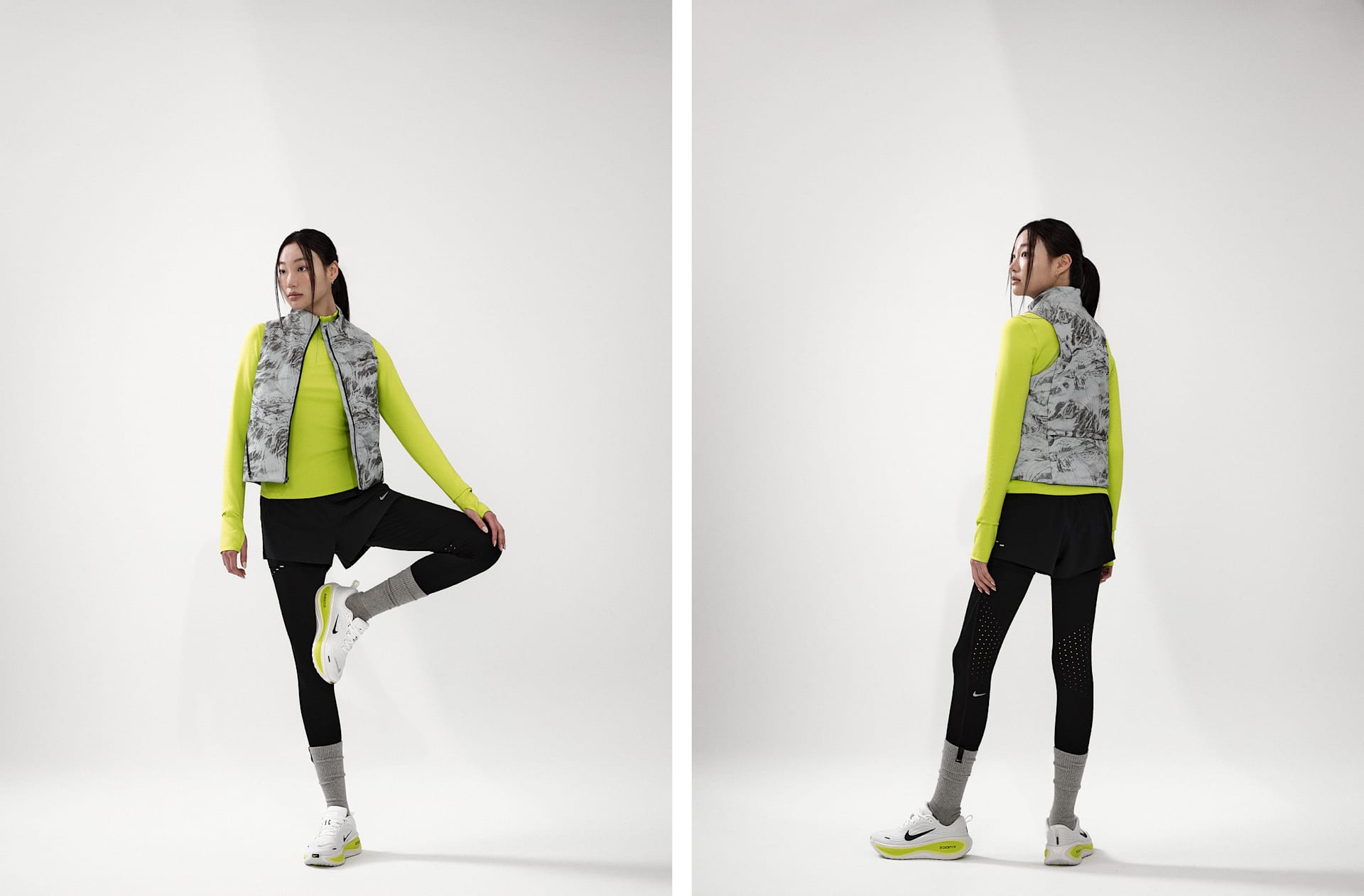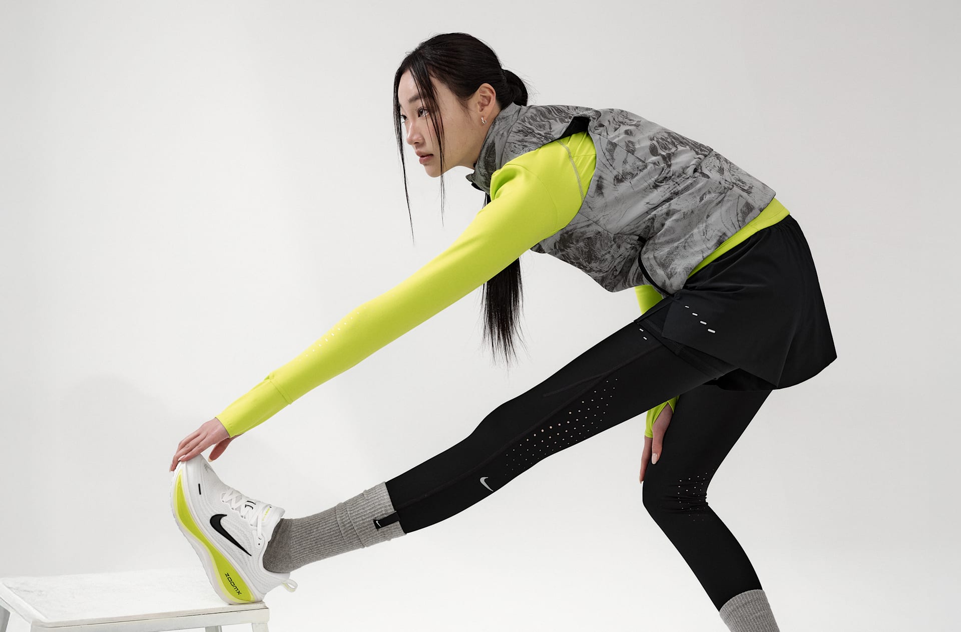 - 몸체: 80% 폴리에스터/20% 폴리우레탄. 타이츠: 88% 폴리에스터/12% 폴리우레탄. 거싯 안감: 100% 폴리에스터.