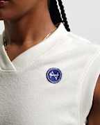 French Terry y pura calma. Esta camiseta de tirantes está confeccionada con una tela tipo toalla, la cual cuenta con diseño de bucle suave en la parte exterior. El cuello en V y las aberturas de tela de canalé le dan a su ajuste relajado un look estructurado y deportivo.