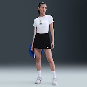 The relaxed vibe of this tee is a foil to a classic, sporty skirt. Think of this as an unexpected combination for a friendly meet-up or an afternoon spent shopping. The addition of a pair of funky, futuristic shoes adds intentional contrast and is a final look-at-me touch.