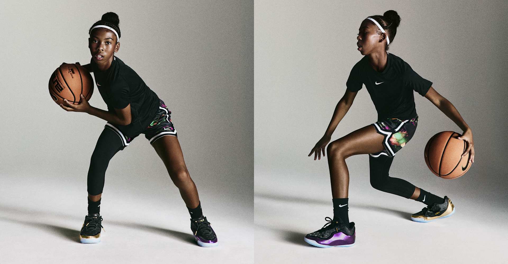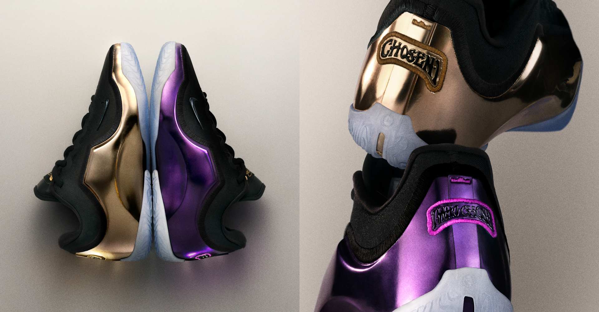 This asymmetrical pairing celebrates when LeBron and Bronny checked into the Lakers’ season opener together on October 24, 2024, marking a historic father-son debut on the court. The right shoe is all about LeBron, complete with his signature gold, as well as his “Chosen 1” icon on the heel. The black-and-purple left shoe honors Bronny with his own "1 Who Chose" heel decal, symbolizing his individual path in the game. The upper pattern on both shoes is a mix of large crowns (saluting LeBron’s long-standing reign) and small crowns (signifying Bronny’s promise).
