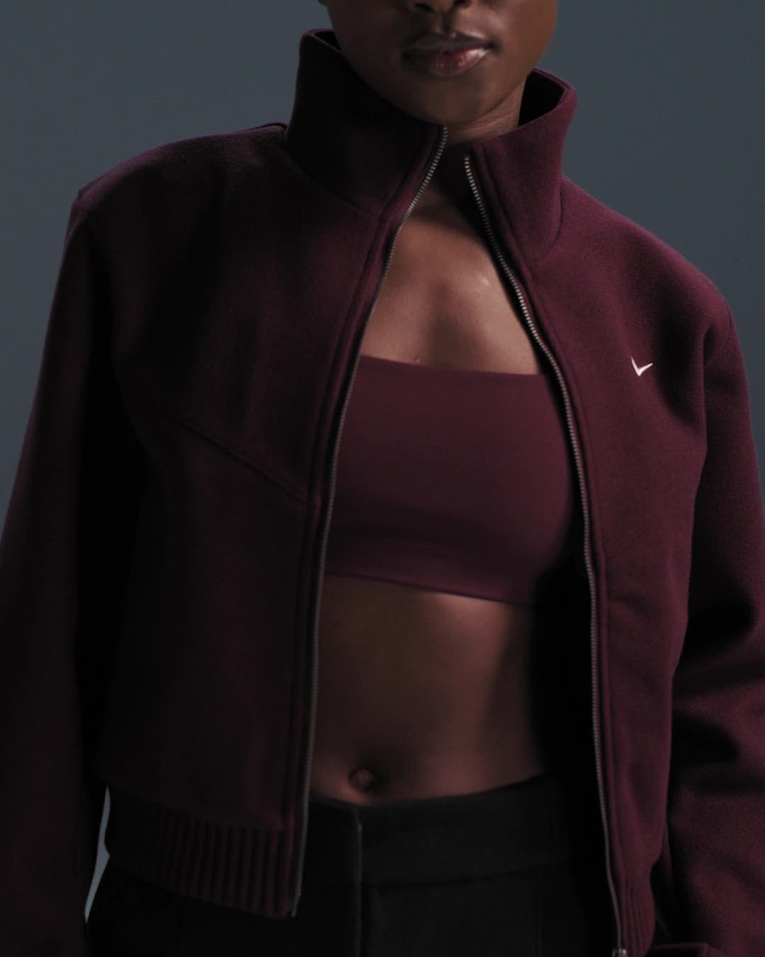Elevating sport inspiration, this jacket is made from structured brushed fleece and has a satin lining for a luxe feel.