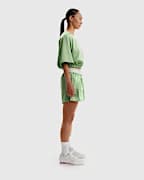 เสื้อตัวนี้ผลิตด้วยผ้าซาตินเพื่อสัมผัสที่หรูหรา ทรงหลวมตลอดช่วงตัวจับคู่กับชายเสื้อแบบยางยืด ให้ทรงบ็อกซี่แบบเอวลอยเล็กน้อย แขนเสื้อเย็บเฉียงทรงหลวมพร้อมรายละเอียดการกุ๊นและคอวีแบบจั๊มพ์เพิ่มสัมผัสสไตล์สปอร์ต