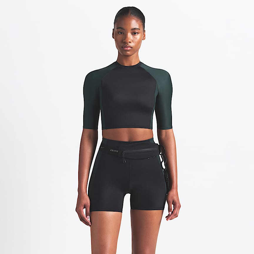 - Cuerpo: 83-88% poliéster, 12-17% spandex; paneles/bolsillo lateral (lado de los nudillos): 83% poliéster, 17% spandex; malla: 91% poliéster, 9% spandex.