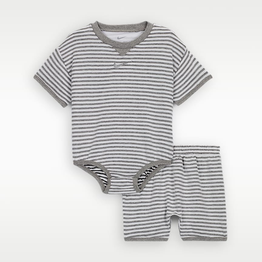 Prepara a los más pequeños para un día de diversión con este conjunto de dos piezas a juego. Ambas piezas cuentan con un estampado a rayas texturizado en toda la prenda y están confeccionadas con un tejido Knit de algodón y poliéster que se siente suave y delicado al contacto con la piel sensible del bebé. El body cuenta con un cuello redondo sin etiquetas, hombros caídos para un ajuste relajado y cierres a presión con cinta en el tiro para que sea más fácil vestir y cambiar al bebé. Los shorts cuentan con una cómoda pretina elástica y un ribete de unión liso en los puños para ofrecer un ajuste seguro.