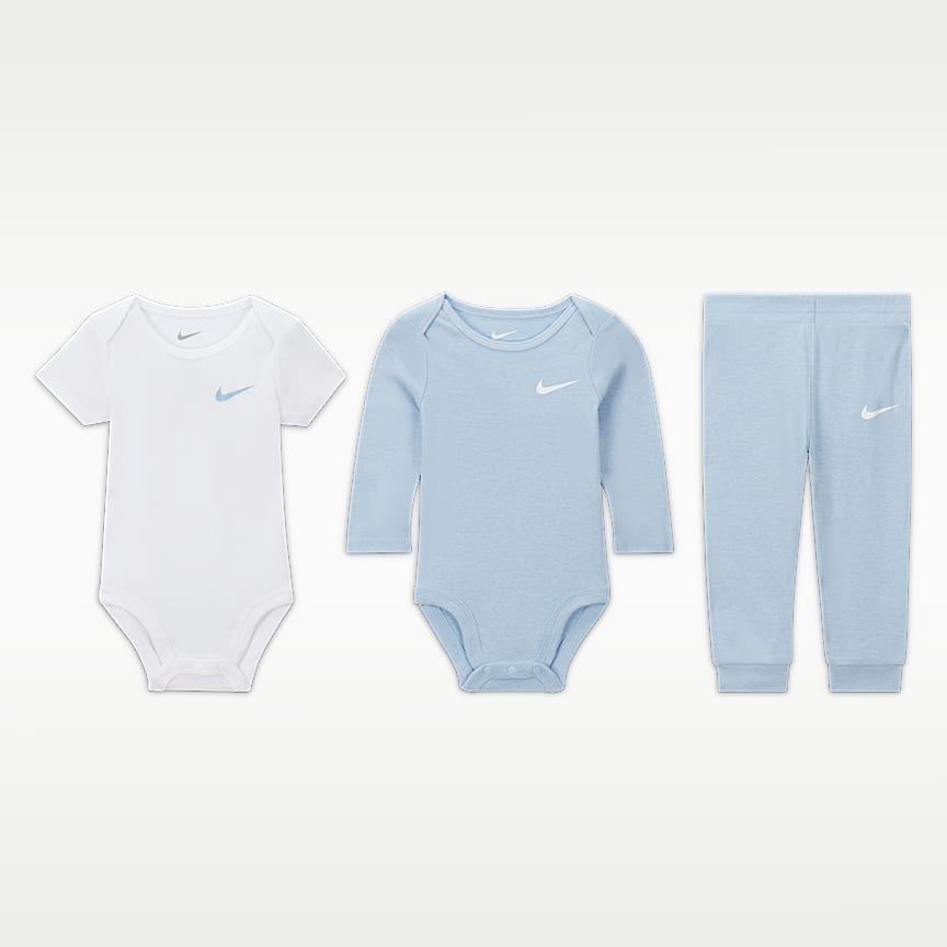 El conjunto Nike New Milestone incluye 2 bodys de manga corta y una manta estampada a juego confeccionada con un suave tejido Knit para un look coordinado con el que tu pequeño puede crecer.