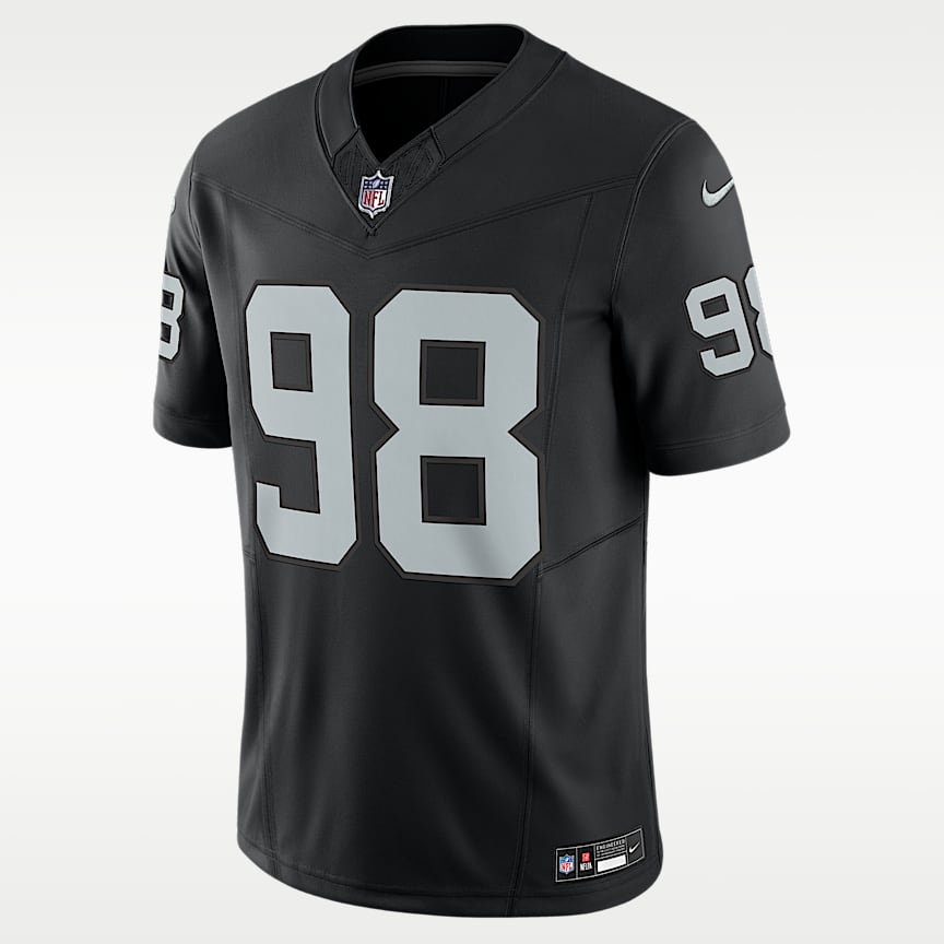 Este jersey de Las Vegas Raiders está confeccionado con tecnología absorbente de sudor para brindar comodidad adicional el día del partido. Sus detalles sublimados te brindan toda la autenticidad del jersey oficial sin un diseño más rígido.
