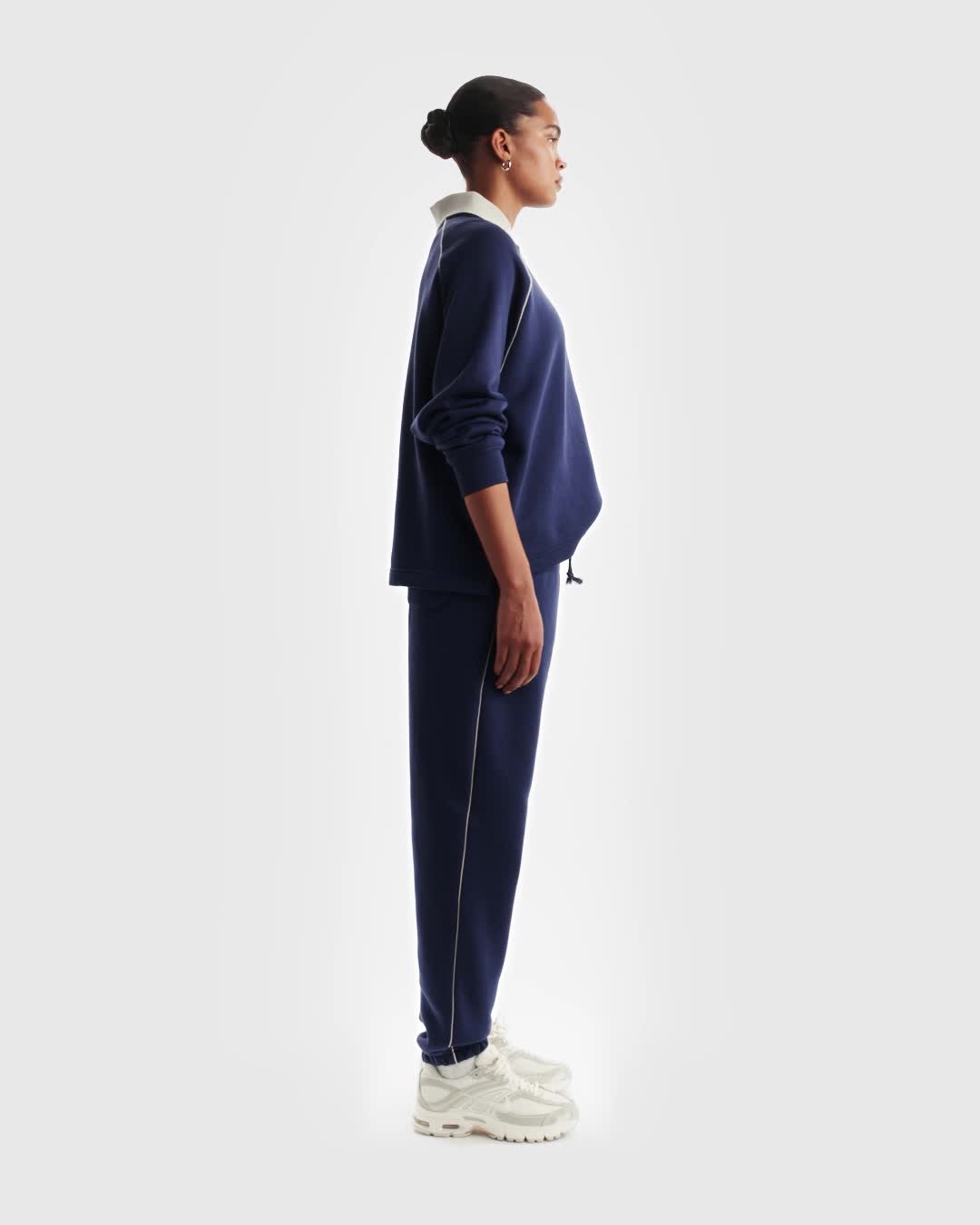 Estos pants están confeccionados en tejido Fleece cepillado de densidad media, el cual es muy suave por dentro y terso por fuera. El ajuste más amplio, los tobillos ceñidos y los detalles de ribete le dan un look holgado pero con un toque refinado.